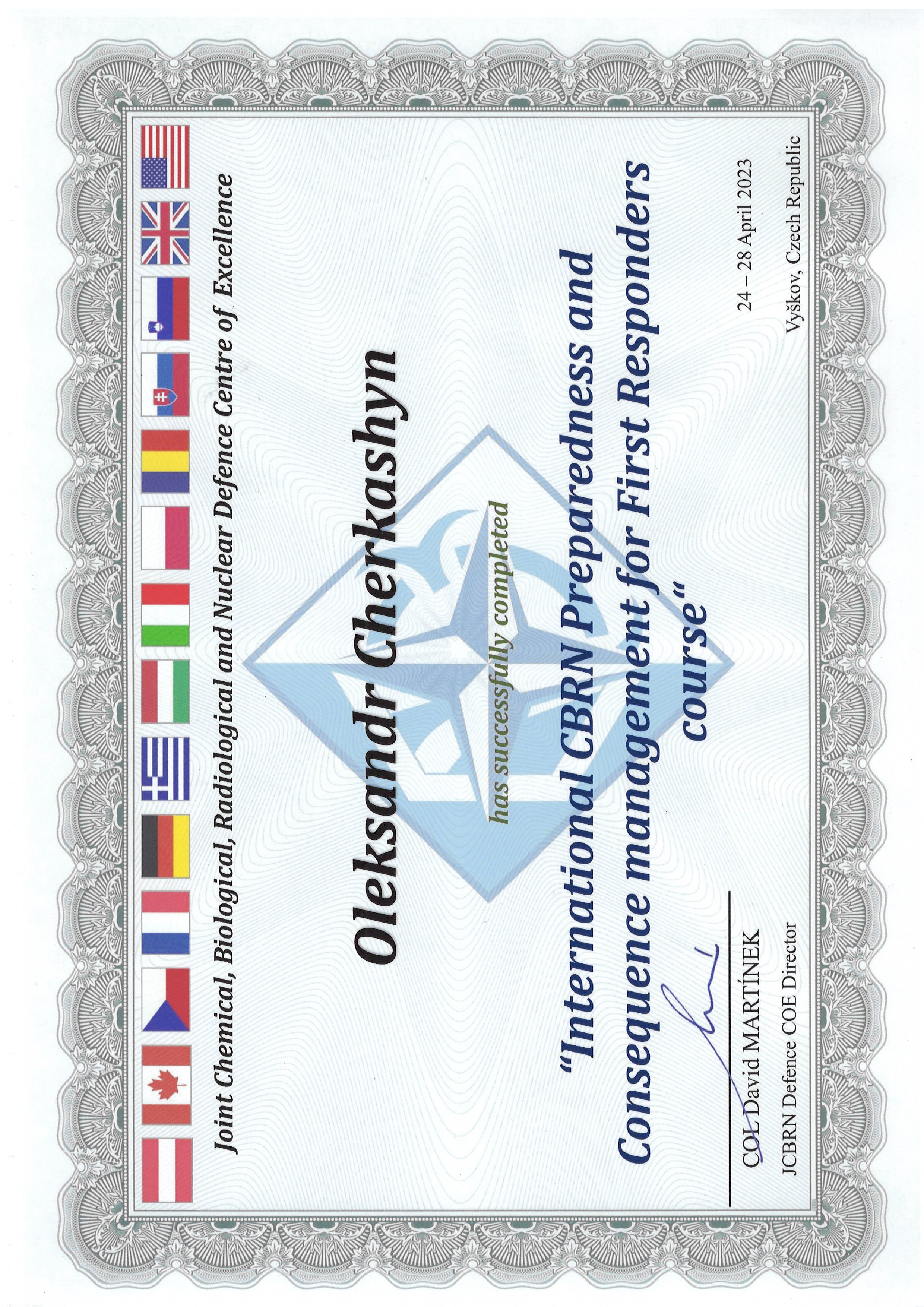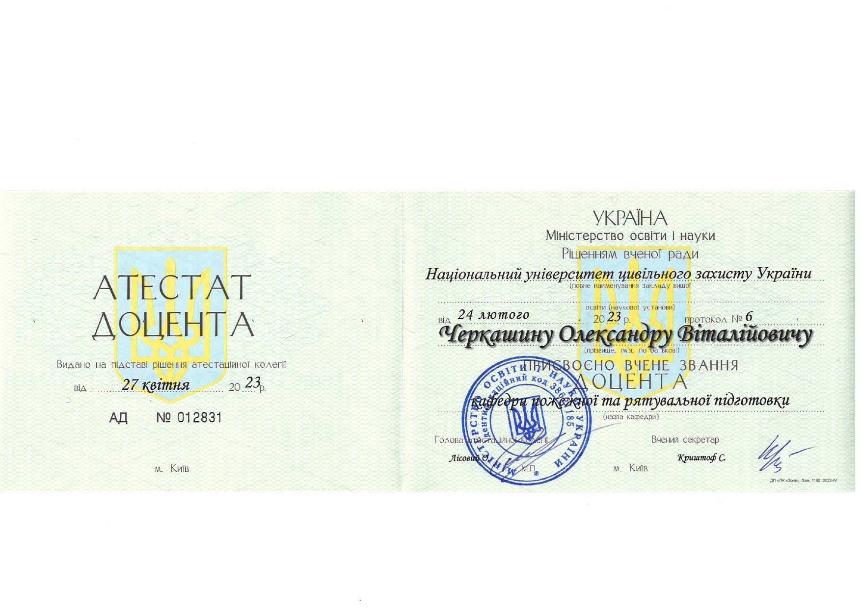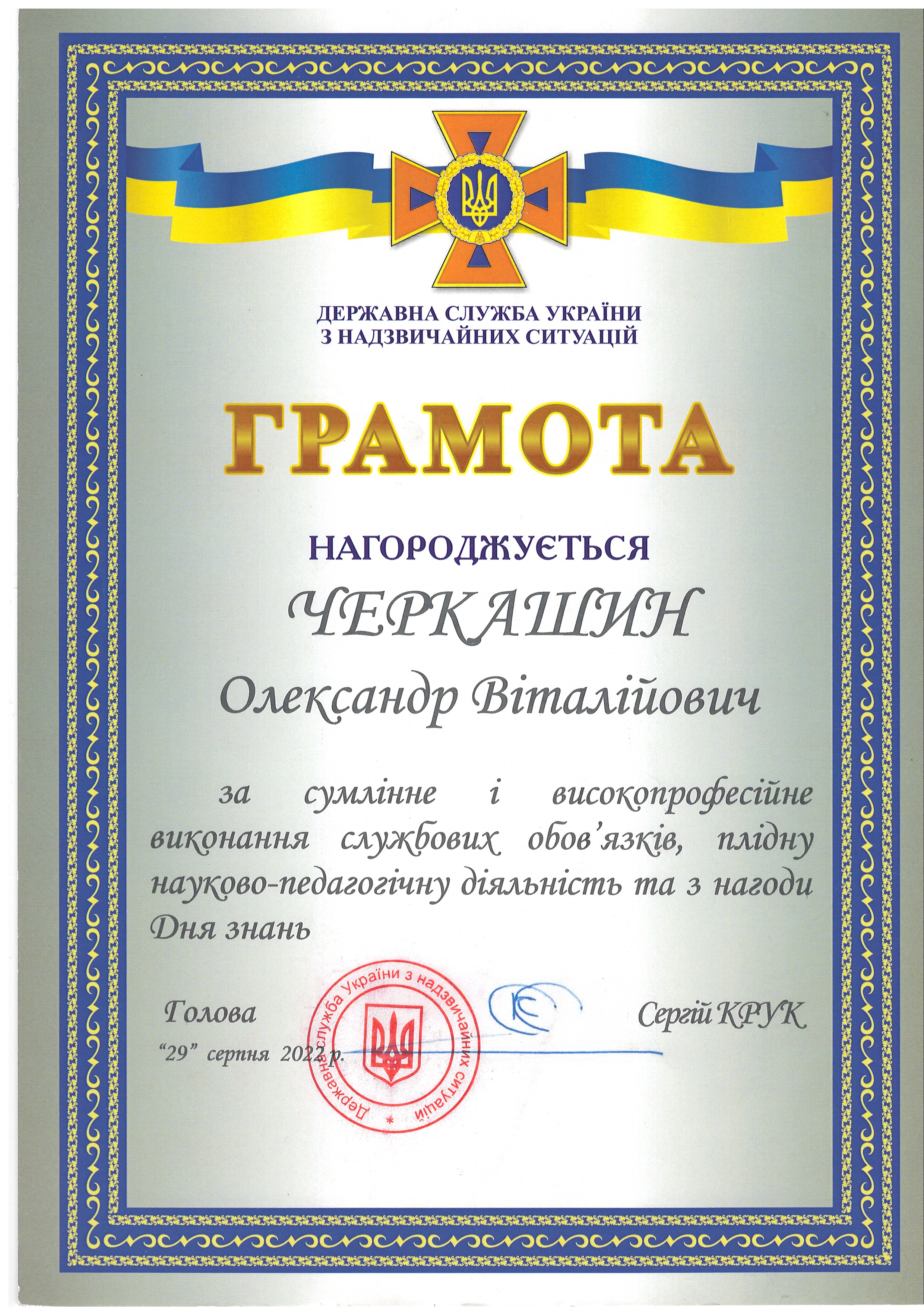 - Research and justification of the time for conducting operational actions by fire and rescue units to rescue people in a fire. / SIGURNOST/. D. Dubinin, A. Lisniak, K. Ostapov, I. Hrytsyna, S. Hovalenkov, D. Beliuchenko, O. Cherkashyn, S. Shcherbak. (2022) 64 (1), Р. 35 - 46 (SCOPUS).