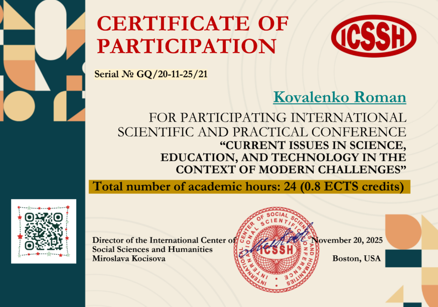 10.Nazarenko, S., Kovalenko, R., Kalynovskyi, A., Nazarenko, V., Pobidash, A., Kravchenko, Y., Shoman, O., Danylenko, V., Sydorenko, O. (2023). Determining the influence of an artificial defect on the mechanical properties of a flexible pipeline material during a rupture test. Eastern-European Journal of Enterprise Technologies, 6 (1 (126)), 29–37. – Way of Access: DOI: 10.15587/1729-4061.2023.291877