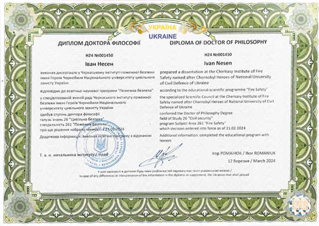 Доктор філософії, 21.06.02 галузь знань 26 «Цивільна безпека», спеціальність -261 «Пожежна безпека», «Обґрунтування табличного методу розрахункового оцінювання класу вогнестійкості для залізобетонних сходових маршів», 2024 рік.