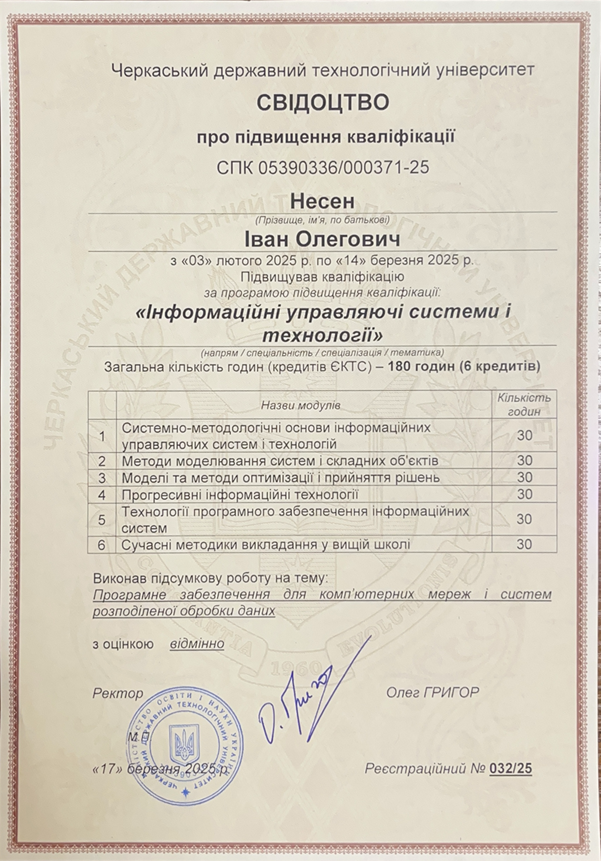 З вересня 2019 року по вересень 2023 року навчався в ад’юнктурі Черкаського інституту пожежної безпеки імені Героїв Чорнобиля Національного університету цивільного захисту України.