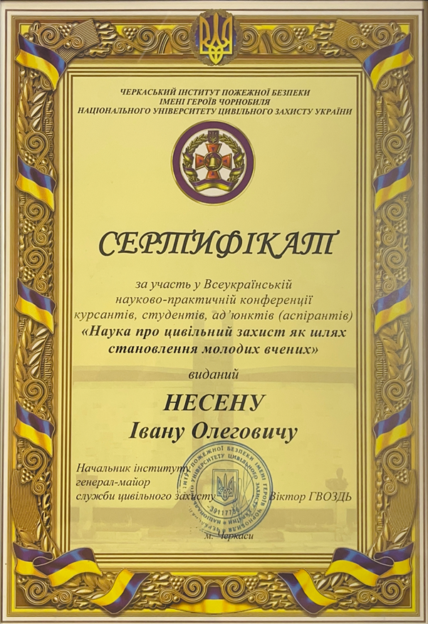 - Збірник наукових праць Черкаського інституту пожежної безпеки імені Героїв Чорнобиля Національного університету цивільного захисту України «Надзвичайні ситуації: попередження та ліквідація» ЧІПБ ім. Героїв Чорнобиля НУЦЗ України 2023р. 6 No 1