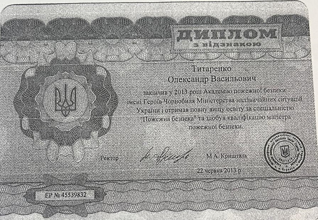 Академія пожежної безпеки ім. Героїв Чорнобиля МНС України 2013 р. Спеціальність — пожежна безпека, кваліфікація — магістр пожежної безпеки.