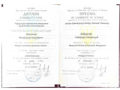 Наукова ступінь: кандидат пед. наук 13.00.06 – теорія і методика управління освітою.