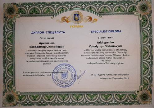 Черкаський інститут пожежної безпеки імені Героїв Чорнобиля Національного університету цивільного захисту України 2002 р. спеціальність - «Пожежна безпека», спеціаліст, кваліфікація –«Інженер пожежної безпеки».