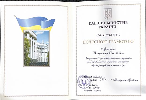 - Почесна грамота КАБІНЕТУ МІНІСТРІВ УКРАЇНИ – 2019 РІК;