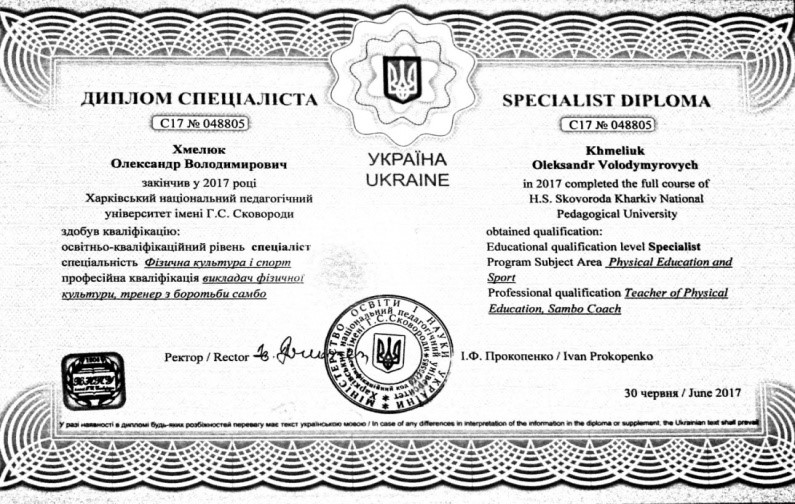 Харківський національний педагогічний університет імені Г.І Сковороди, 2017 рік, спеціальність «Фізична культура і спорт», професійна кваліфікація «Викладач фізичної культури, тренер з боротьби самбо».