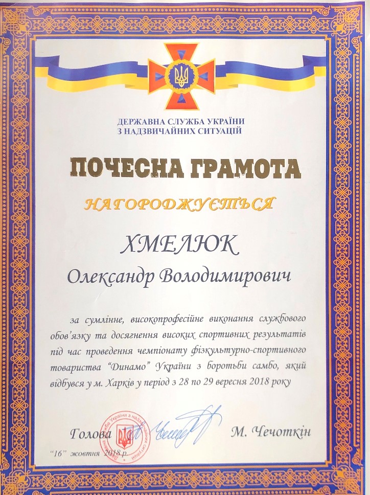 Першість чемпіонату ДСНС України з боротьби самбо 2018 рік І -ше командне місце.