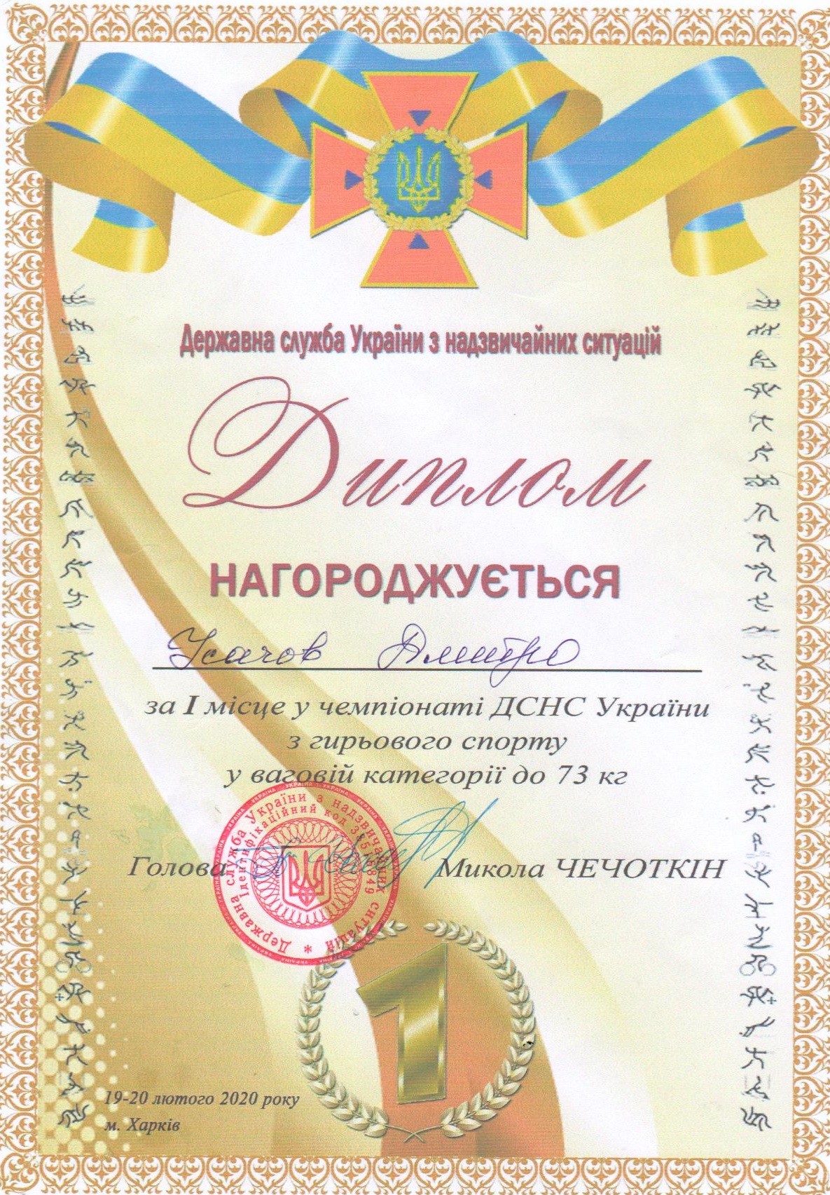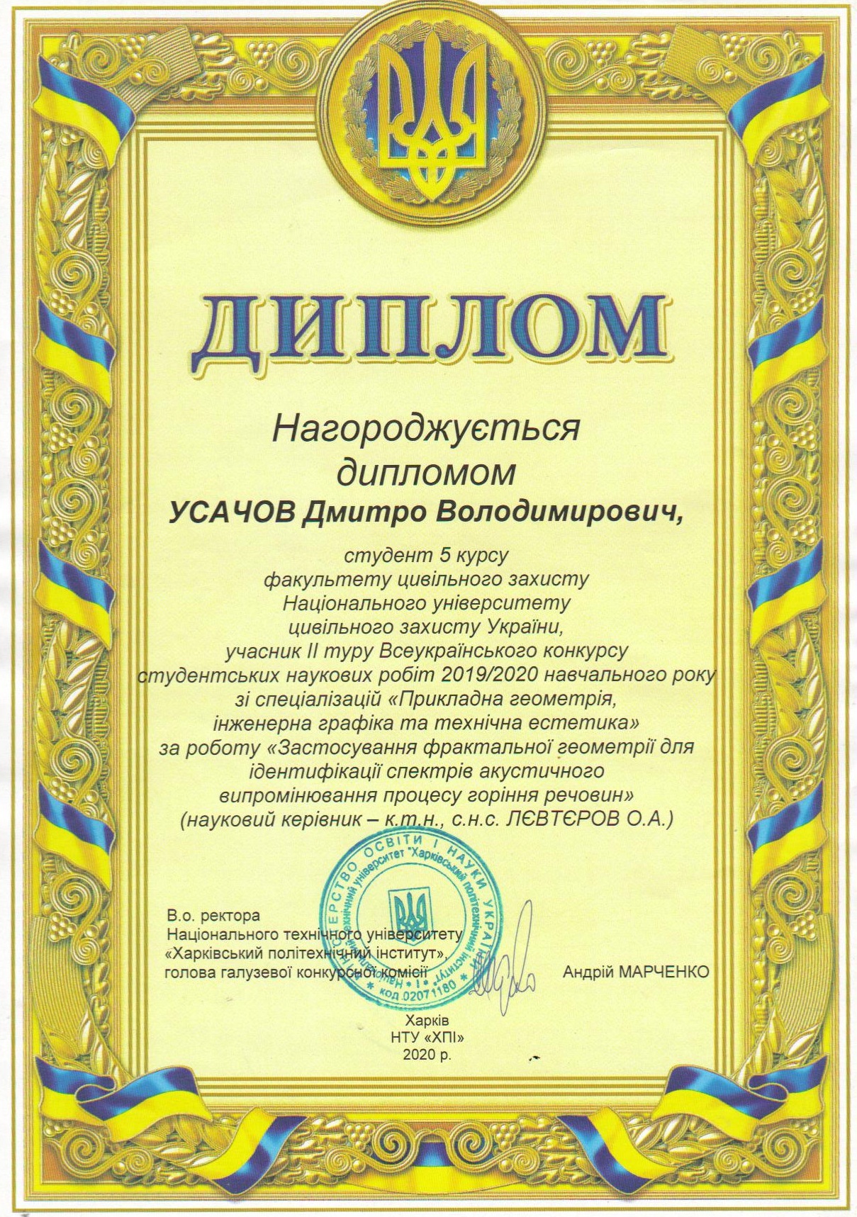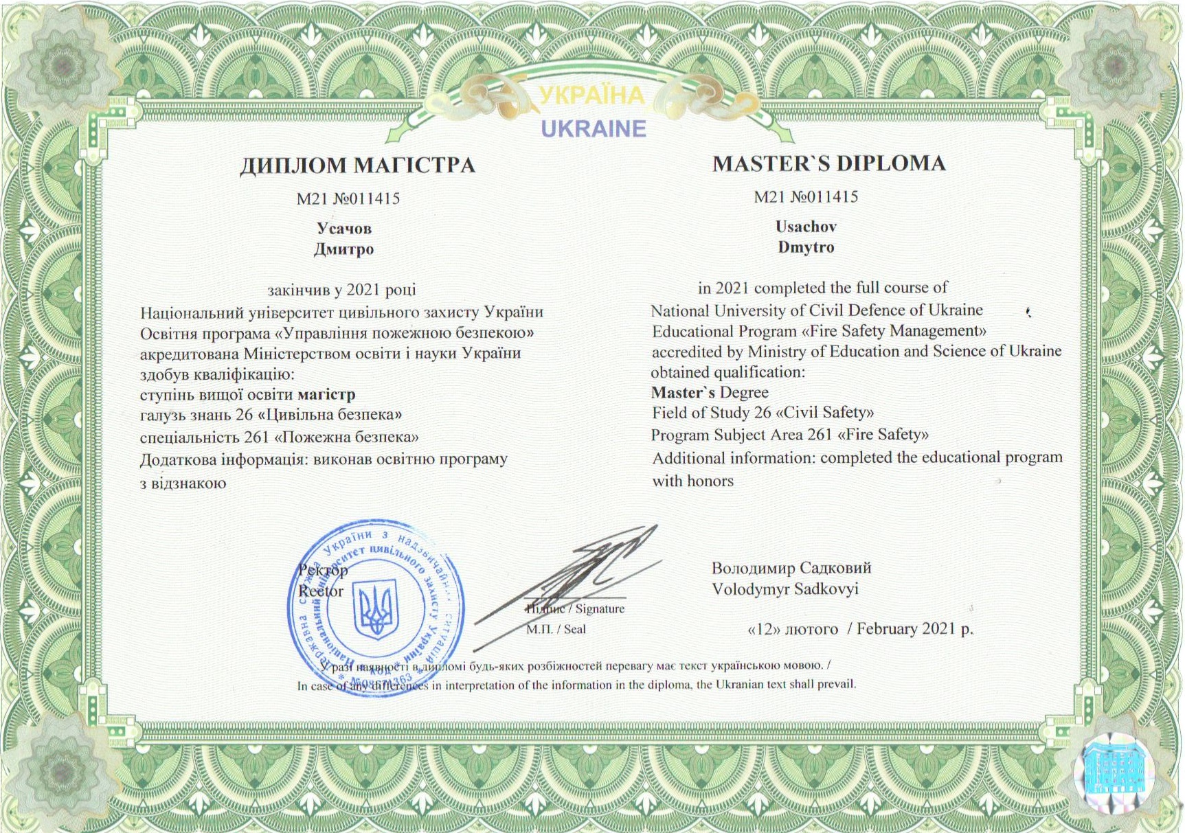 У серпні 2019 року вступив на денну форму навчання до магістратури Національного університету цивільного захисту України за спеціальністю «Управління пожежною безпекою», яку закінчив з відзнакою.
