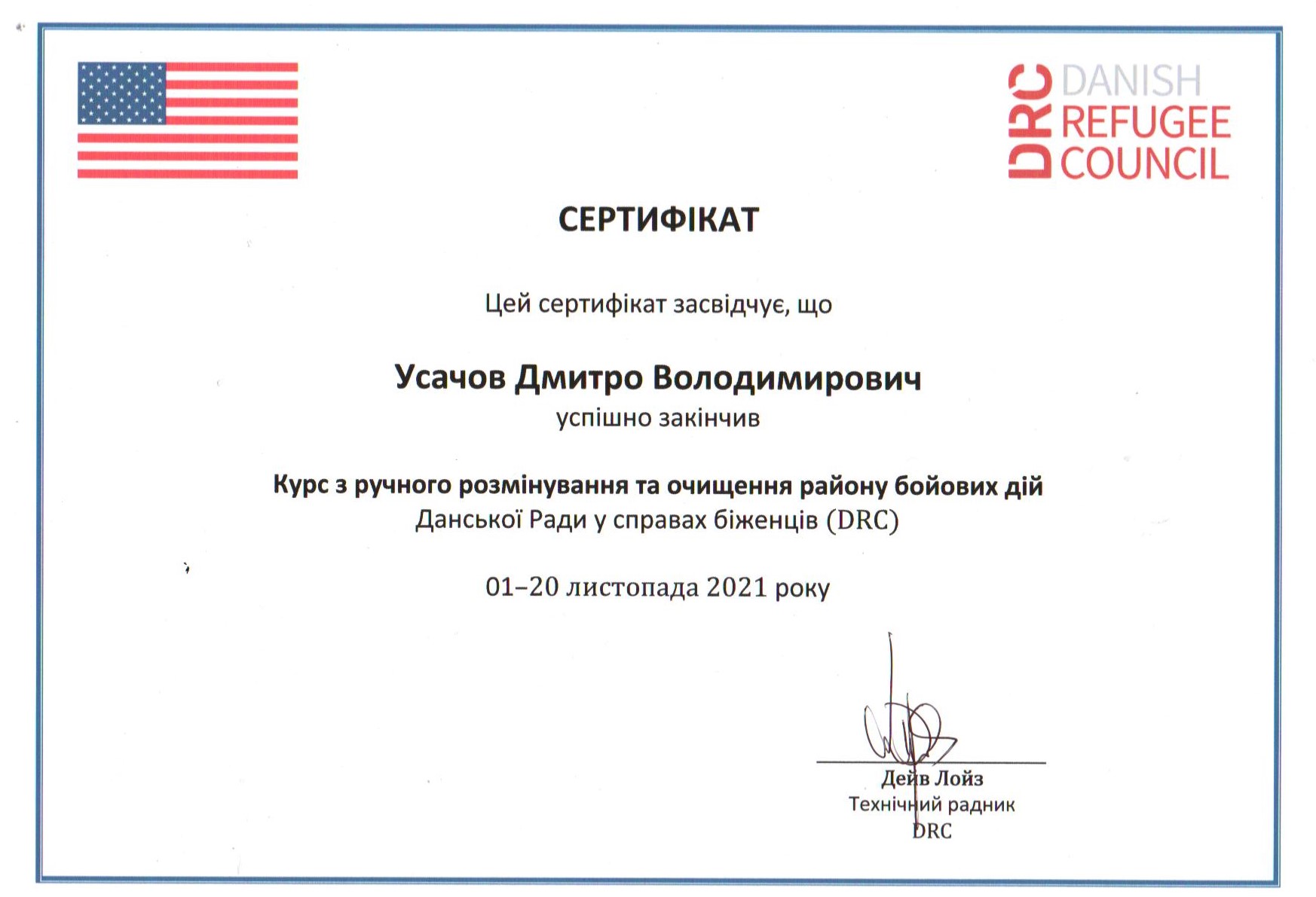 Hавчальний курс підготовки фахівців з гуманітарного розмінування та знешкодження вибухонебезпечних предметів для піротехнічних підрозділів ДСНС України, який проводили фахівці Данської групи у справах біженців/Данської групи з розмінування (DRC-DDG) на навчально-матеріальній базі Міжрегіонального центру гуманітарного розмінування та швидкого реагування ДСНС України.