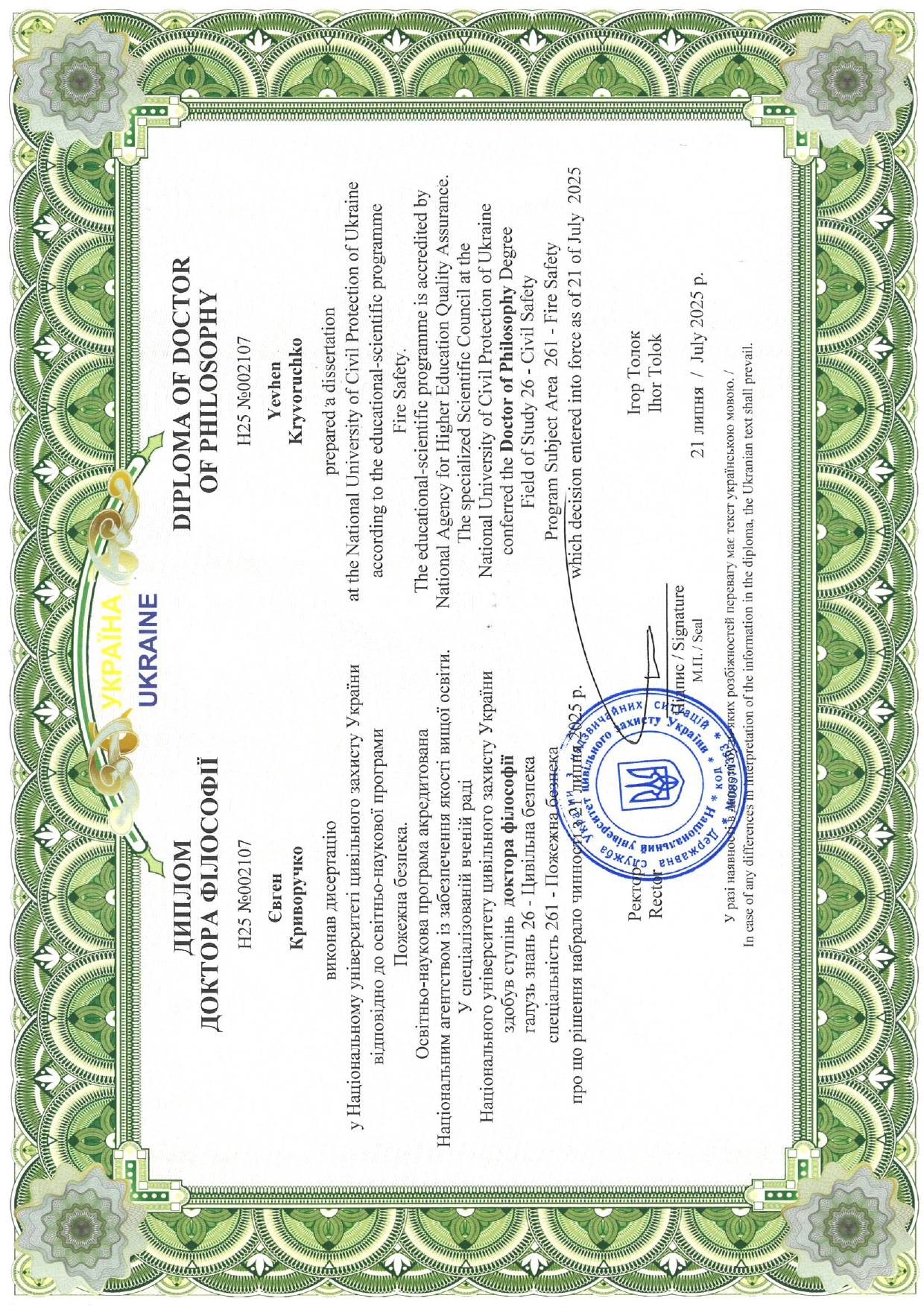 Доктор філософії за спеціальністю 261”Пожежна безпека”, 2025р.