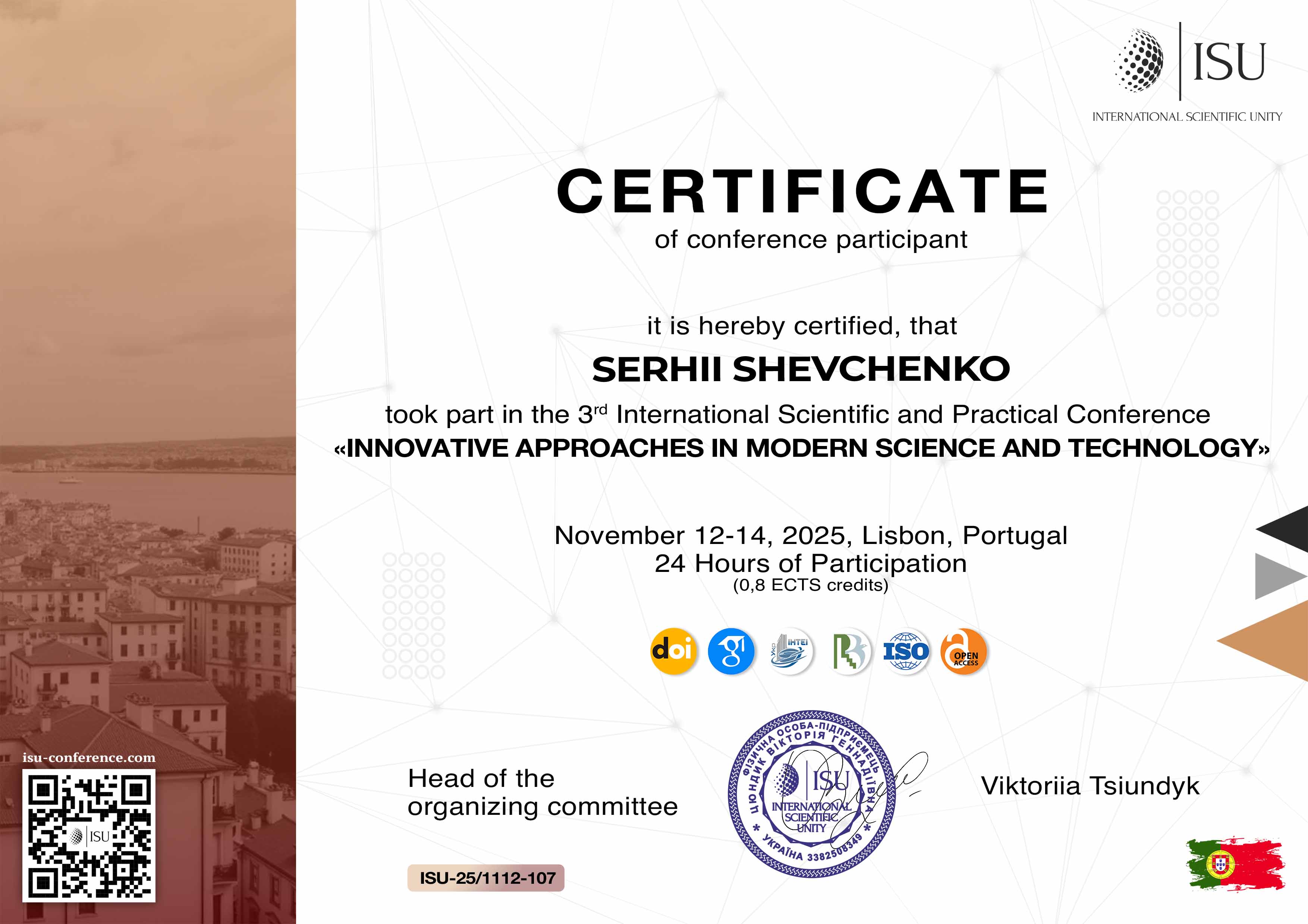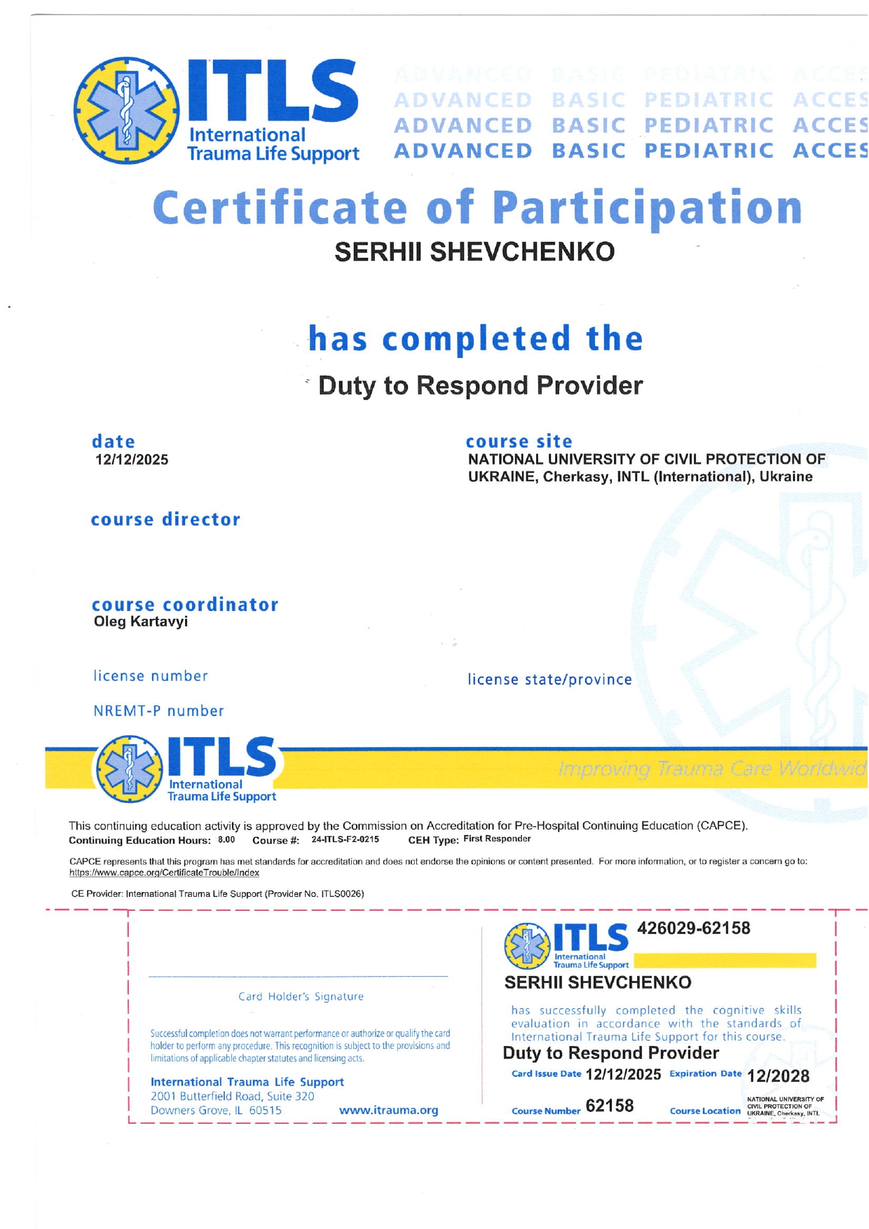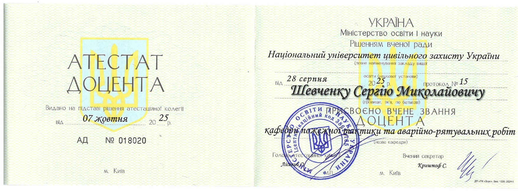 07 жовтня 2025 року присвоєне вчене звання доцента кафедри Пожежної тактики та аварійно-рятувальних робіт