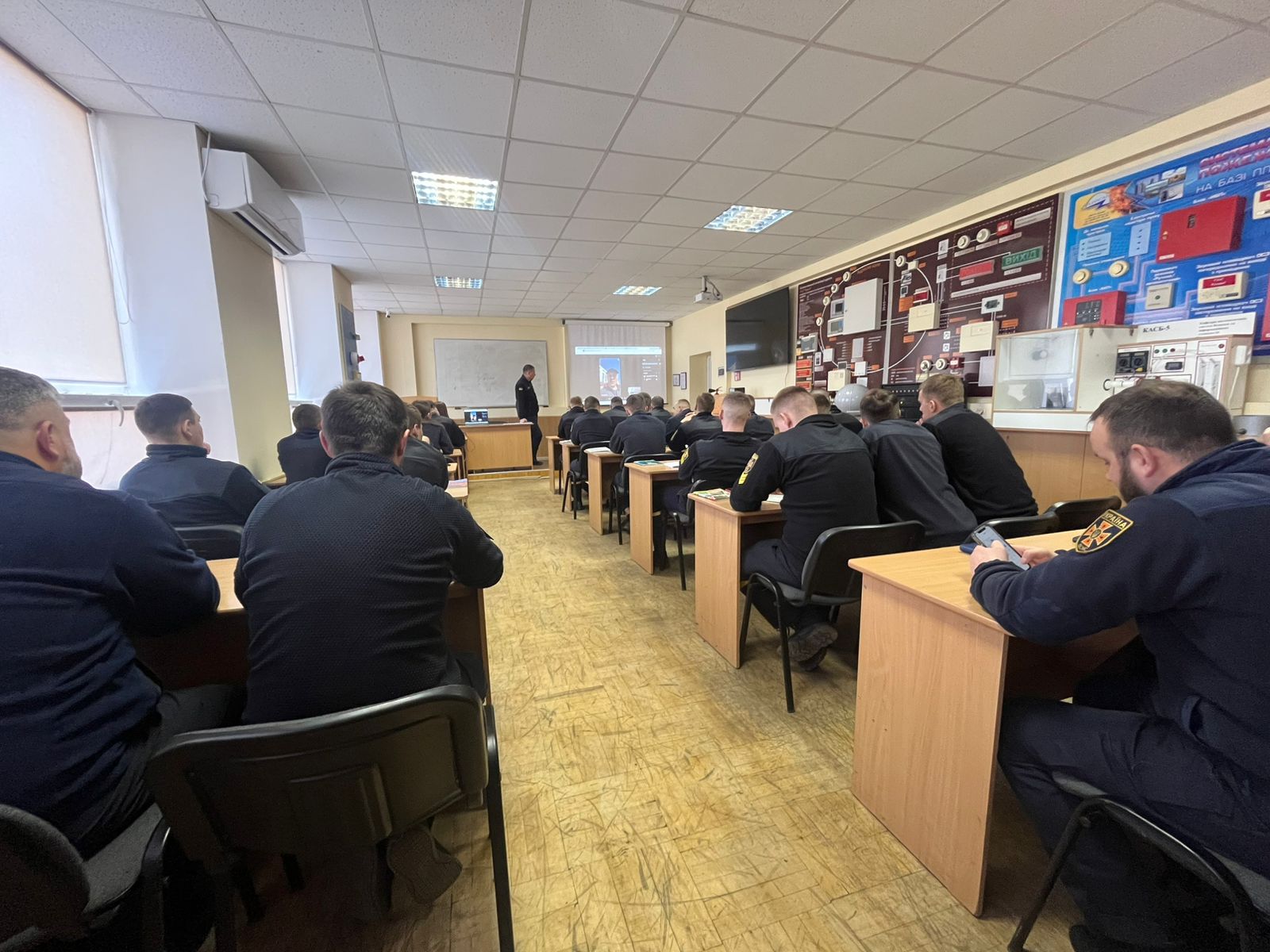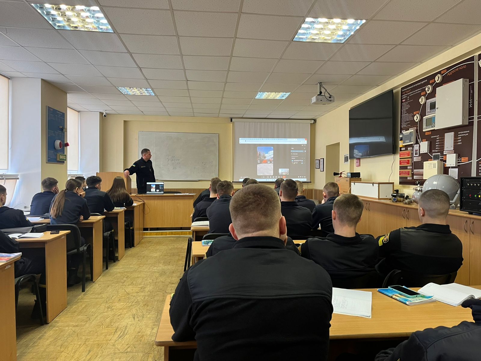 Співробітник гарнізону м. Київ поділився з курсантами практичним досвідом виконання завдань під час реагування на надзвичайні ситуації, розповів про особливості організації оперативно-тактичних дій, а також про застосування сучасної спеціальної пожежної техніки під час ліквідації НС.